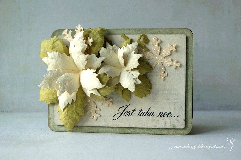One more Christmas card with poisenttias. The sentiment on the card is in Polish 'There is the night...'. Any time I read these words it always reminds me about well known, old Polish carol 'Jest taki dzień' by Czerwone Gitary (click). I have added cream poisenttias and sparkly snow flakes which I cut out from hand made glittered paper which I have found in my bits and bobs bag.